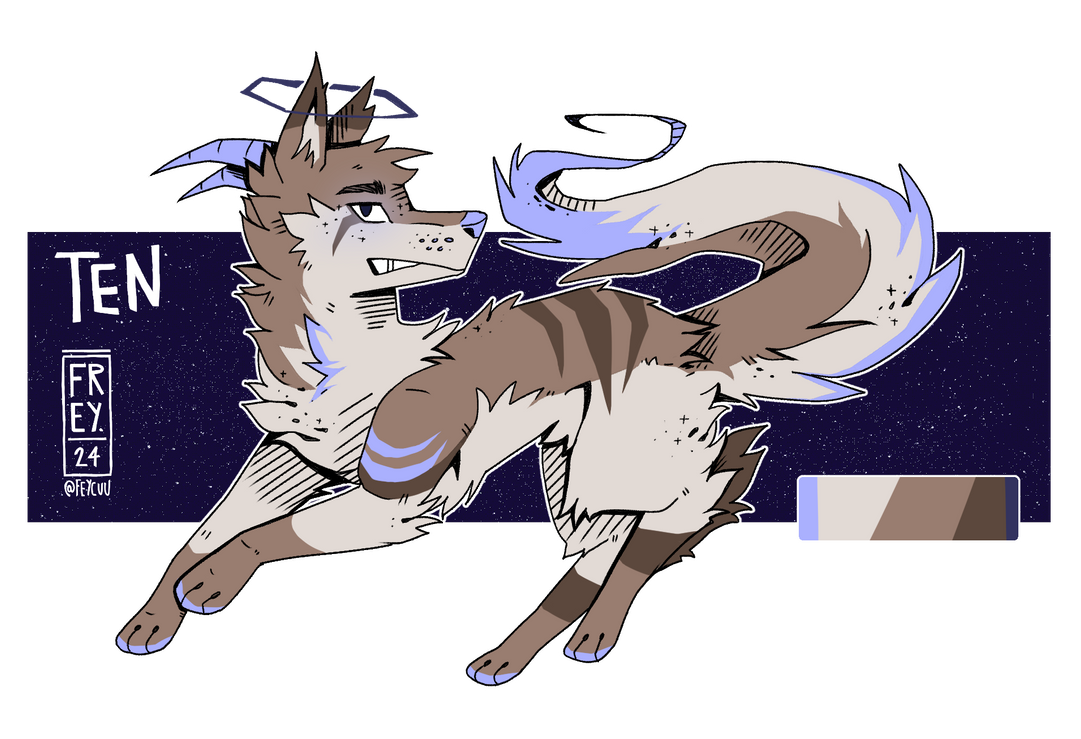 TEN is a character that i created with a few things in mind: i wanted him to represent my love for space, my love for angels, and my love for dr. who for some reason. i always liked the idea of earth-colored ocs and in contrast to my other canines i wanted to give him a more natural set of colors. okay, the blue is not too natural, but this is where space comes in!